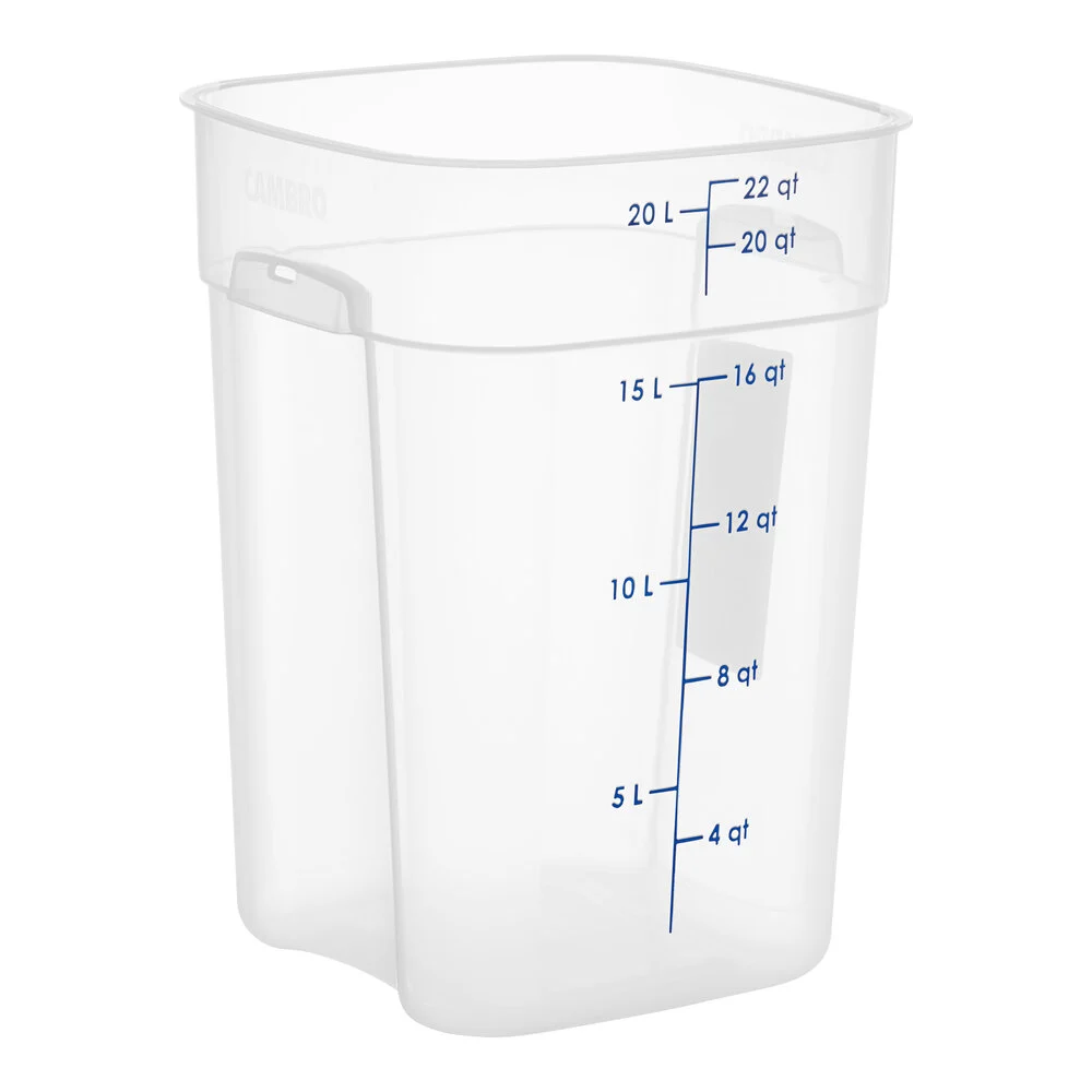 Δοχείο Cambro CamSquares® FreshPro (20.8 L) από ημιδιαφανές πολυπροπυλένιο (PP, BPA‑free) για οικονομική και αξιόπιστη αποθήκευση τροφίμων σε επαγγελματικές κουζίνες. Οι ενσωματωμένες, βαθιές εσοχές λαβών και οι στρογγυλεμένες γωνίες διευκολύνουν τον χειρισμό και το άδειασμα, ενώ οι ευανάγνωστες βαθμονομήσεις απλοποιούν το portioning. Θερμοκρασιακή αντοχή −40°C έως 70°C, αντοχή σε λεκέδες/οσμές, NSF και πλυντηρίου. Συμβατό με FreshPro Easy Seal Covers και σχάρες στραγγίσματος.