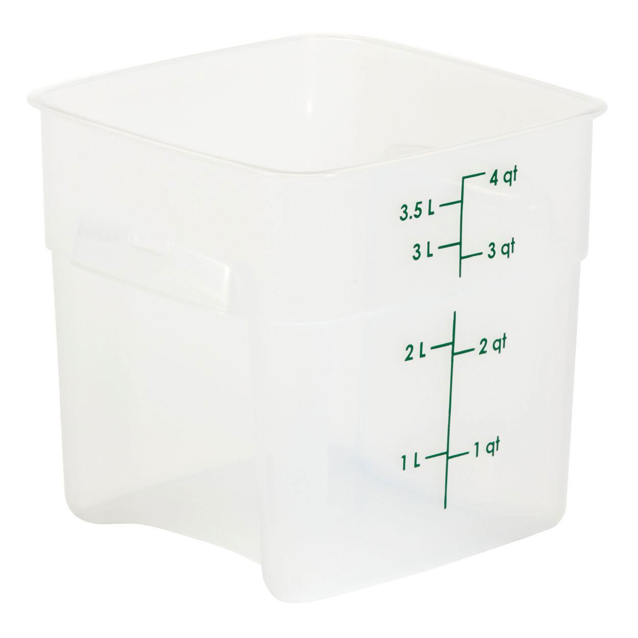 Δοχείο Cambro CamSquares® FreshPro (3.8 L) από ημιδιαφανές πολυπροπυλένιο (PP, BPA‑free) για οικονομική και αξιόπιστη αποθήκευση τροφίμων σε επαγγελματικές κουζίνες. Οι ενσωματωμένες, βαθιές εσοχές λαβών και οι στρογγυλεμένες γωνίες διευκολύνουν τον χειρισμό και το άδειασμα, ενώ οι ευανάγνωστες βαθμονομήσεις απλοποιούν το portioning. Θερμοκρασιακή αντοχή −40°C έως 70°C, αντοχή σε λεκέδες/οσμές, NSF και πλυντηρίου. Συμβατό με FreshPro Easy Seal Covers και σχάρες στραγγίσματος.