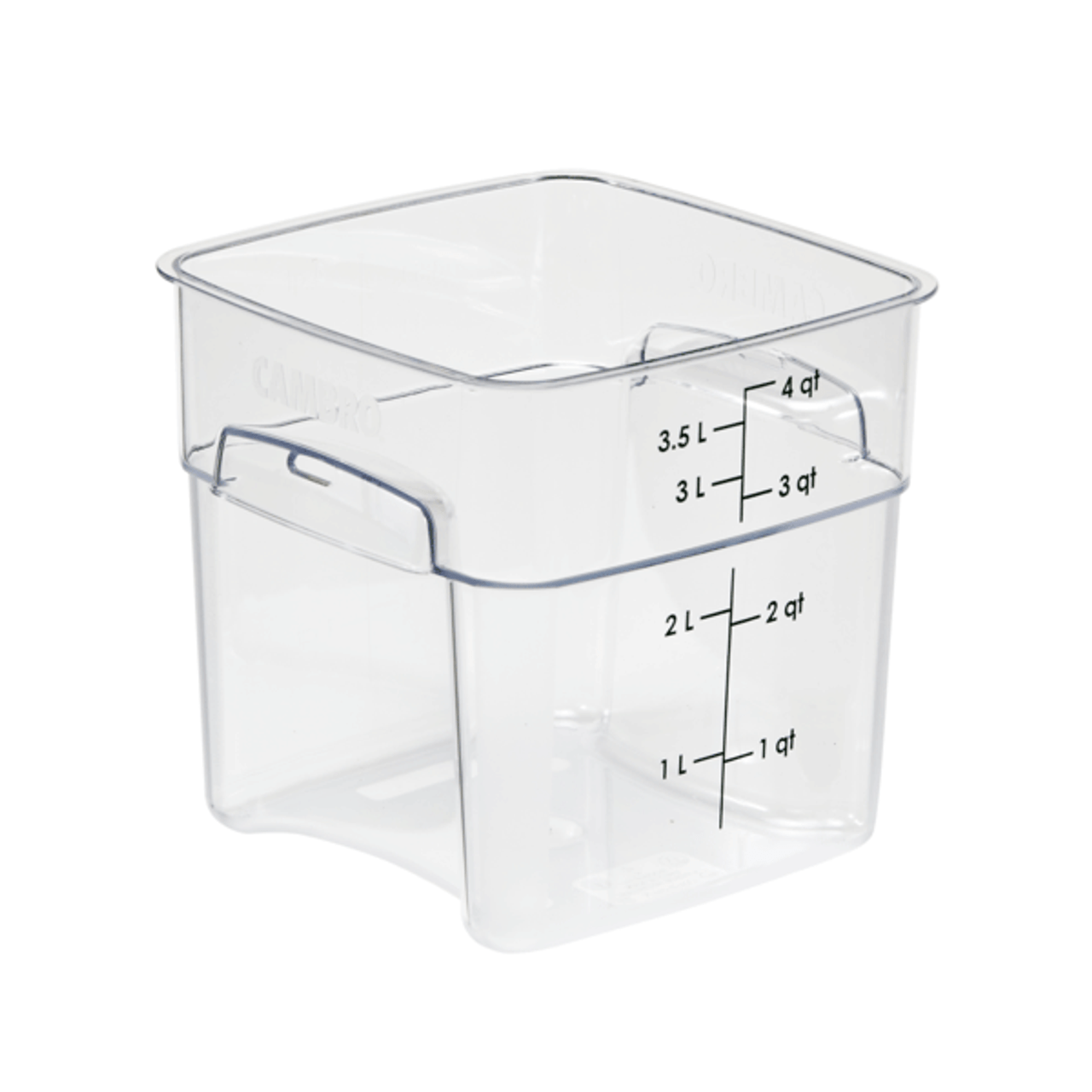 Δοχείο αποθήκευσης Cambro CamSquares® FreshPro (3.8 L) από διαφανές Camwear® πολυκαρβονικό, σχεδιασμένο για βαριά επαγγελματική χρήση σε κουζίνες HORECA. Οι εσοχές λαβών και οι στρογγυλεμένες γωνίες εξασφαλίζουν ασφαλές κράτημα και ελεγχόμενο, τετραπλεύρo ράντισμα/χώσιμο, ενώ οι ευδιάκριτες βαθμονομήσεις επιταχύνουν τον έλεγχο αποθεμάτων. Ανθεκτικό σε θερμοκρασίες από −40°C έως 99°C, NSF και πλυντηρίου πιάτων, στοιβάζεται σταθερά για μέγιστη εκμετάλλευση χώρου. Συμβατό με τα Easy Seal Covers FreshPro και προαιρετικές σχάρες στραγγίσματος.