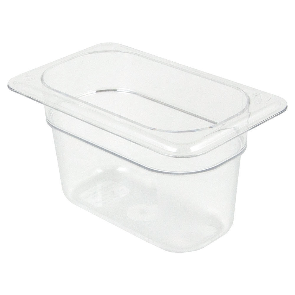 Δοχείο τροφίμων Cambro Camwear® GN 1/9 (100), βάθος 100 mm, από διάφανο πολυκαρβονικό Camwear® για σκληρή επαγγελματική χρήση. Αντέχει −40°C έως 99°C, δεν ραγίζει/λυγίζει, με λείες εσωτερικές επιφάνειες για εύκολο καθάρισμα και στοίβαξη χωρίς κόλλημα. Ιδανικό για ψύξη/προετοιμασία/σερβίρισμα σε πάγκους GN.
