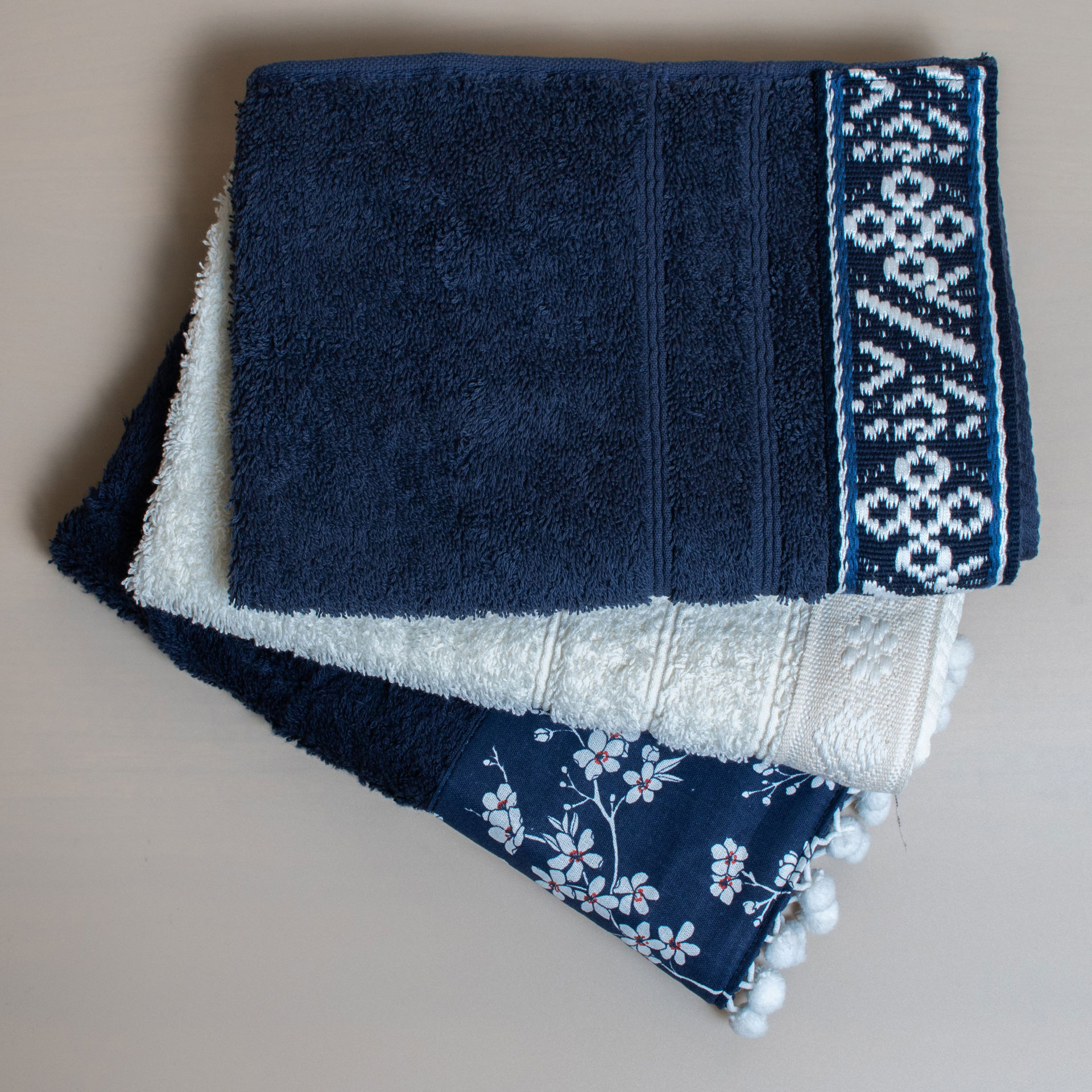 Σετ τριών πετσετών χεριών από 100% βαμβάκι, εξαιρετικά απαλές και απορροφητικές. Διακοσμημένες με χειροποίητες φάσες, προσθέτουν διακριτική πολυτέλεια και στυλ. Ιδανικές για καθημερινή χρήση ή ως ιδιαίτερο δώρο. Χαρακτηριστικά: Από 100% βαμβάκι 600gr/m² Μεγέθη: Προσώπου | Διάσταση : 50 x 100cm Προτεινόμενη θερμοκρασία πλύσης 30°C